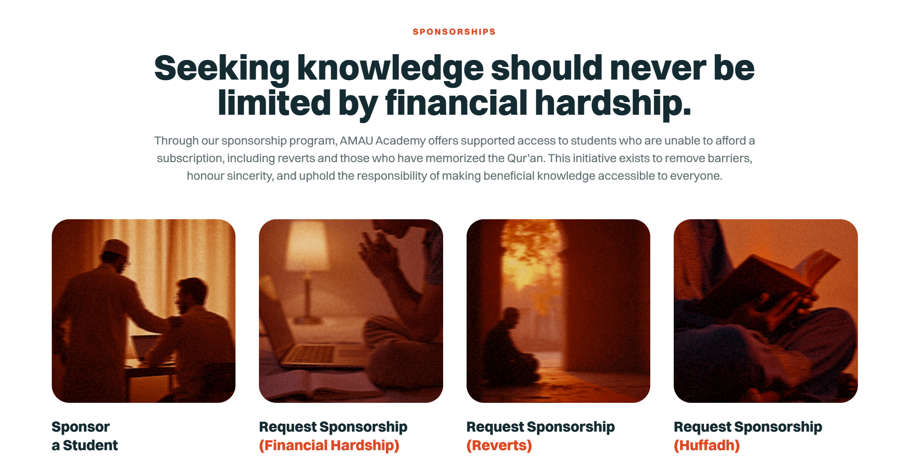 At AMAU Academy, we understand that some students may face financial difficulties while pursuing Islamic knowledge. For this reason, sponsorship opportunities may be available for students who cannot afford the subscription.