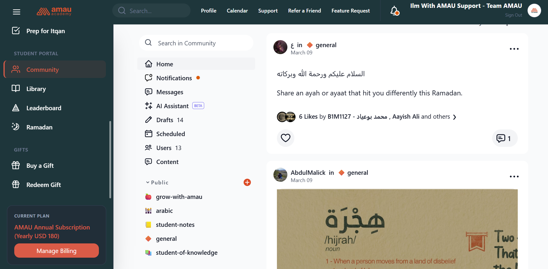 Community & Student SupportImagine logging in to AMAU and stepping into a vibrant space where every member is a fellow seeker of knowledge. This is not just a forum---it’s your digital space to connect, reflect, and grow alongside others who share your passion for learning. Welcome to the AMAU Student Community.
