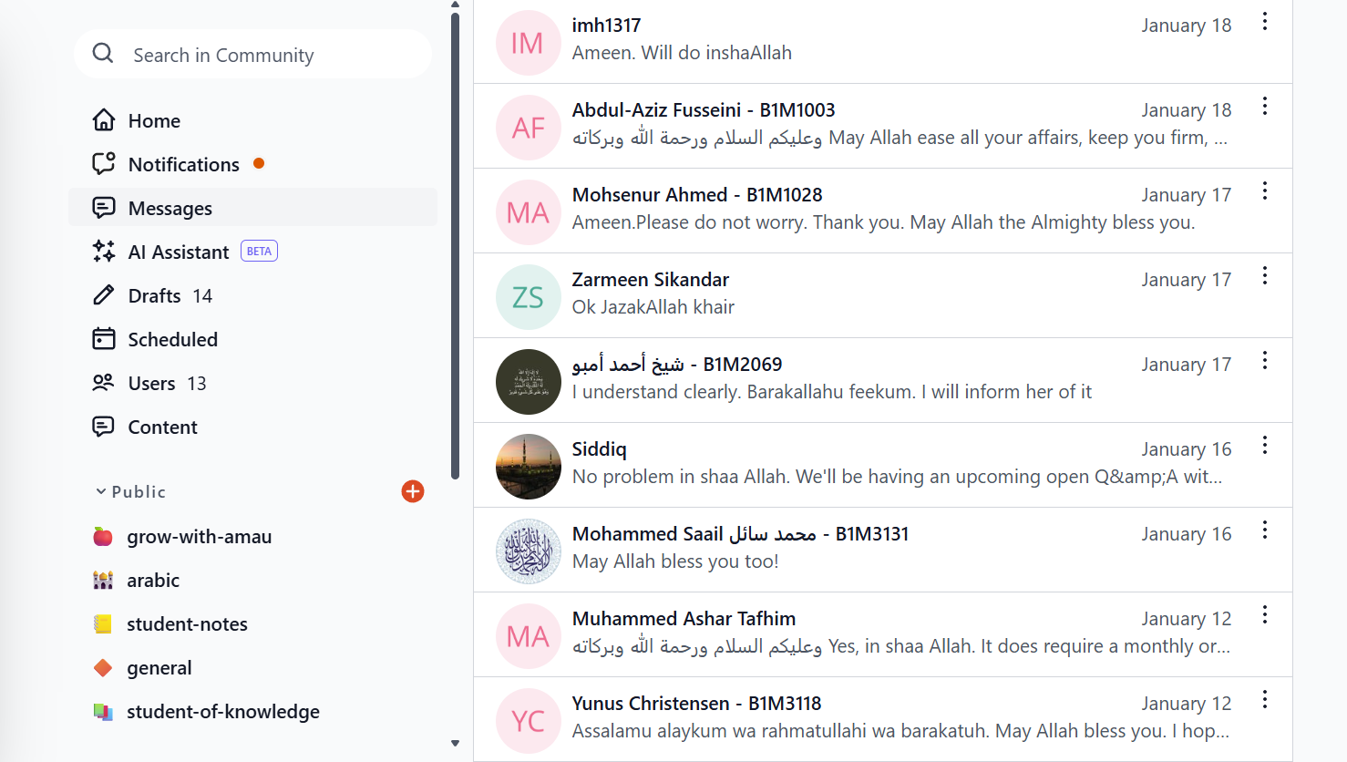 - Home Feed: Your main hub for the community. Scroll through posts from different members across channels. Like walking into a halaqa, you see ongoing discussions, reflections, and shared resources.